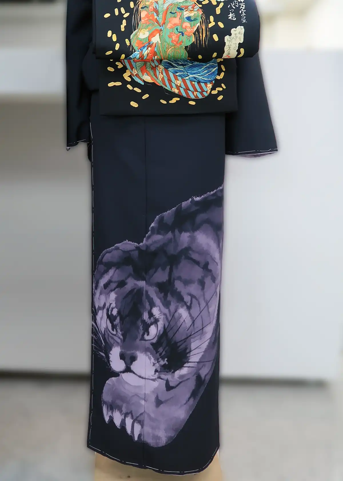 一見すると墨絵のような落ち着いた雰囲気ですが、裾には巨大な虎がどどん! 江戸時代の絵師・長沢芦雪の代表作「虎図(襖絵)」をモチーフにした着物です。